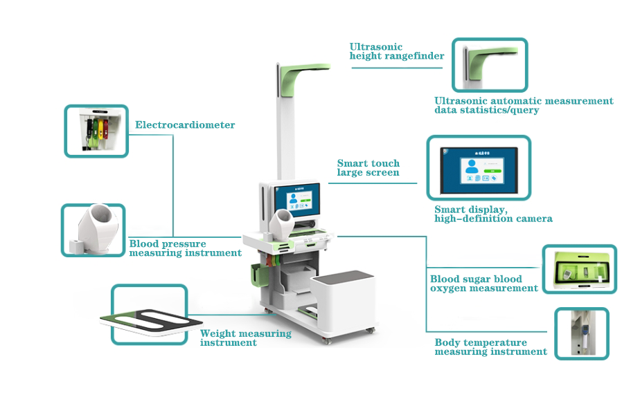 The main operating area adopts a 24-inch capacitor-controlled touch screen, dust-proof design, neat and beautiful, stable performance, and the appearance is standard with light green, representing health, vitality, and progress. At the same time, it supports customization of various colors, full voice-guided self-service operation, supports brushing ID cards, input mobile phone numbers or face recognition, integrated design for file building and measurement, conforming to operating habits, convenient for mobile, equipped with a high-definition camera, standard thermal printer, high-efficiency printing of physical examination reports, and supports data docking of third-party platforms.