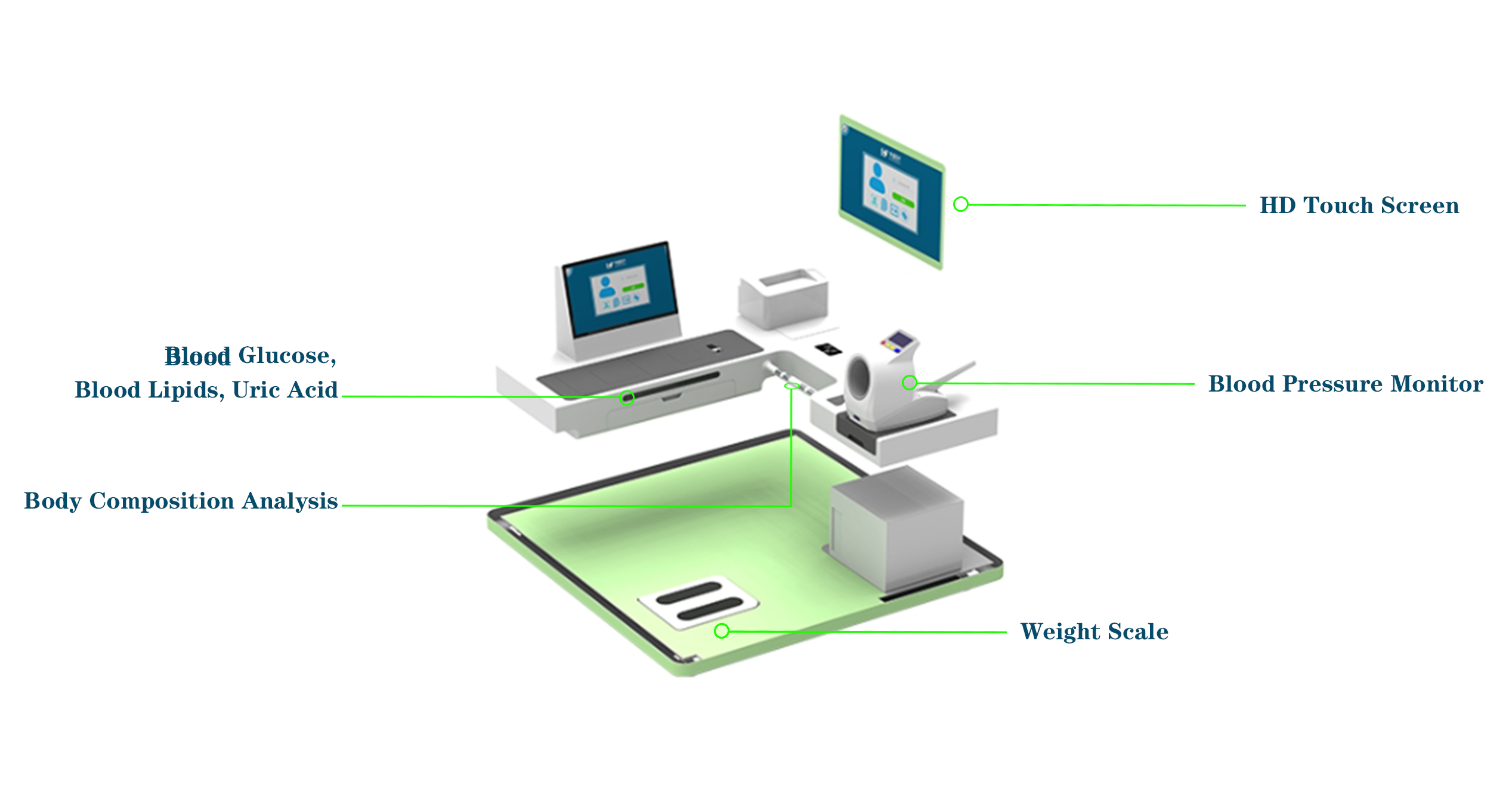| Ultrasonic Height and Weight | Height range 70-205cm, accuracy ±0.5cm, using high-precision sensors. Weight range 2.0-250KG, accuracy ±0.1KG, using precision balance beam sensors. |